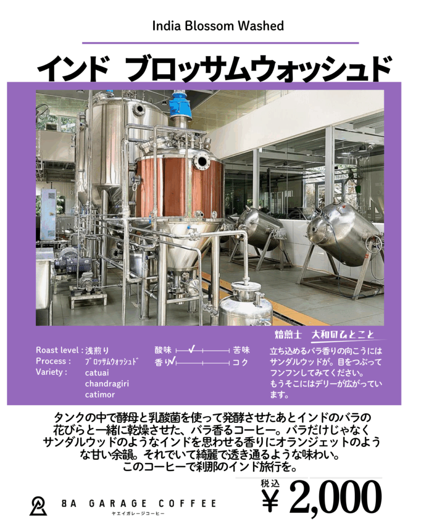 タンクの中で酵母と乳酸菌を使って発酵させたあとインドのバラの花びらと一緒に乾燥させた、バラ香るコーヒー。このコーヒーで刹那のインド旅行を。