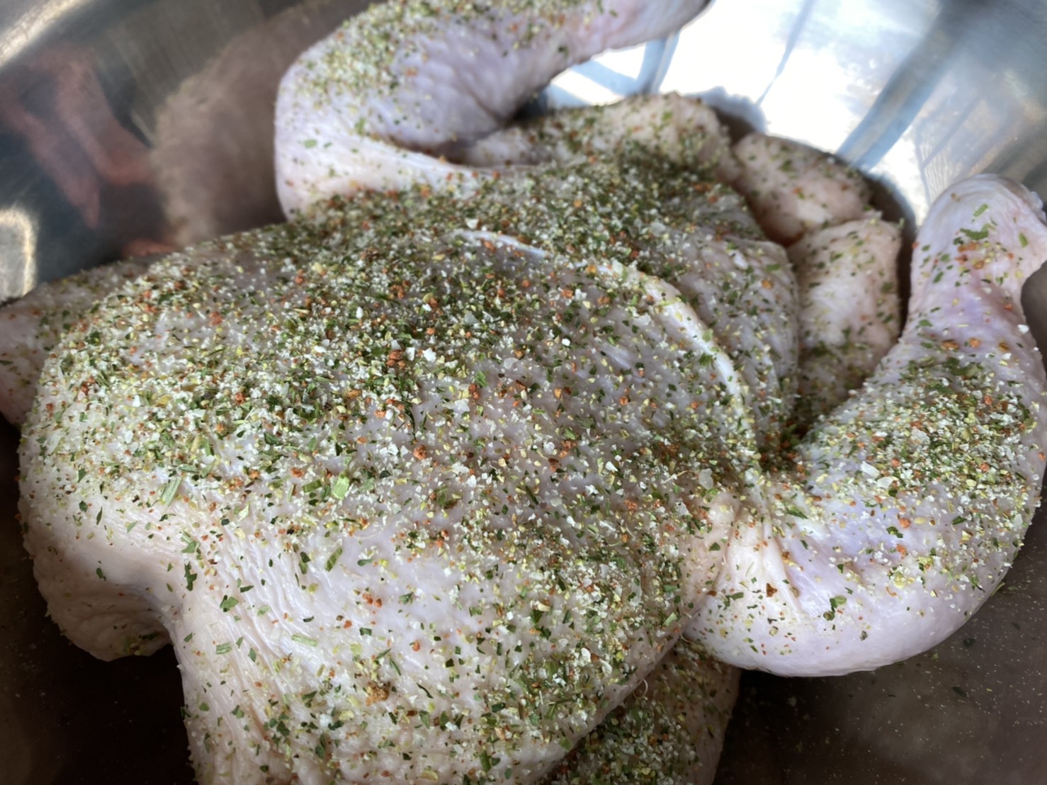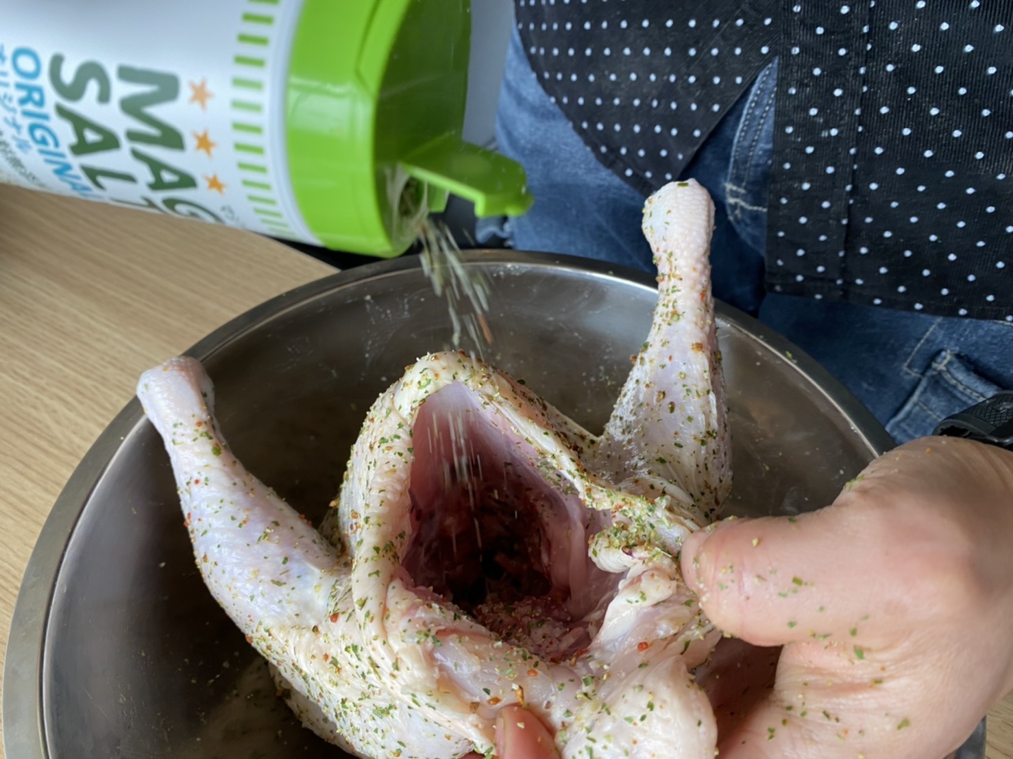 いよいよ、マジックソルトを丸鶏に振りかけ味付けをしていきます。