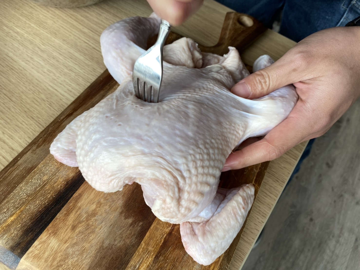 鶏全体に満遍なく穴があくまでひたすらフォークを刺し続けましょう。