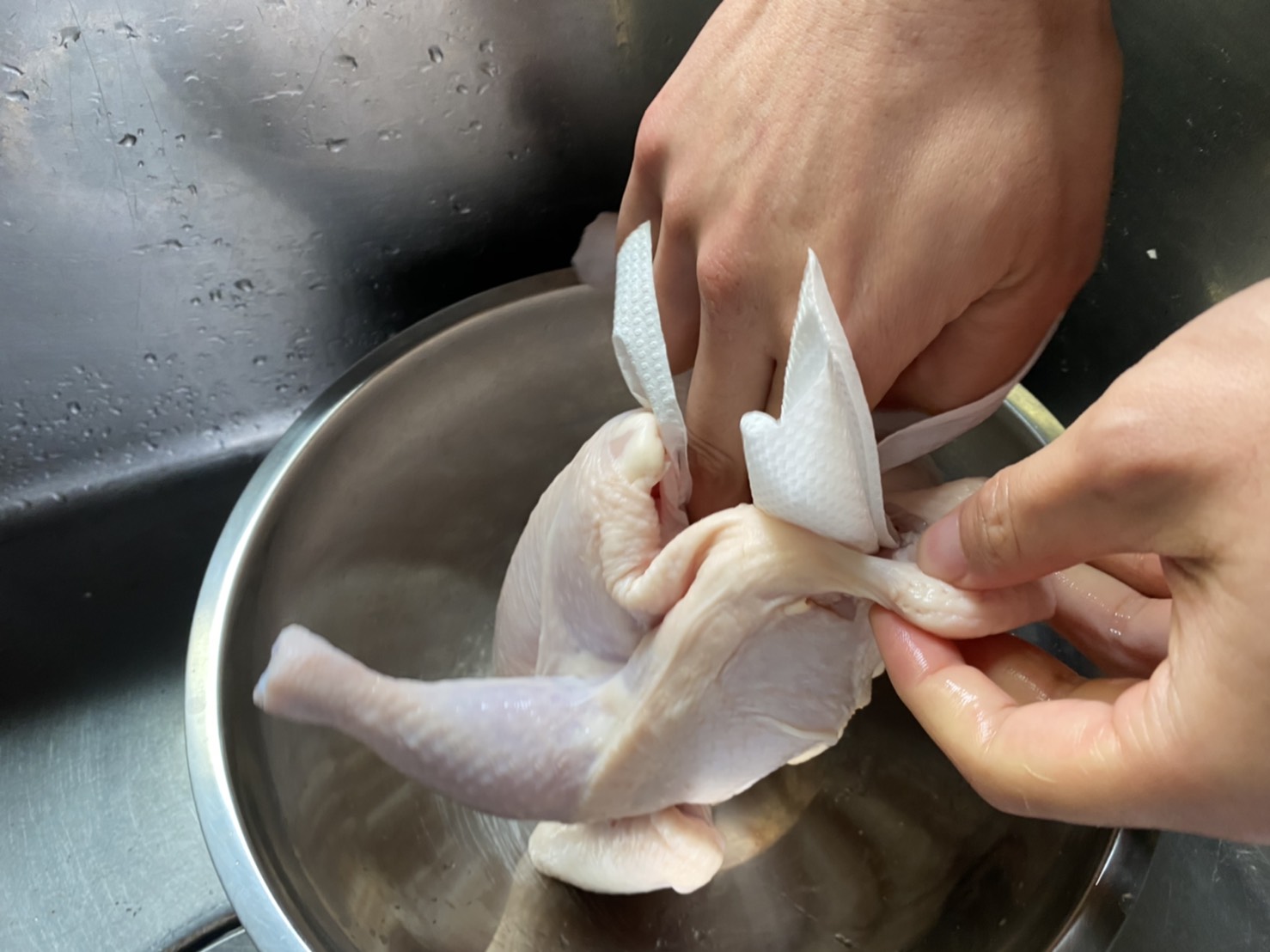 まずは丸鷄を水で洗い、血やドリップを洗い流します。